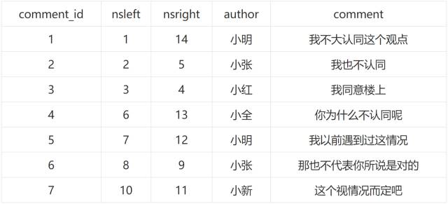 比如搜索评论#6及其所有祖先,可以通过搜索#6的ID在哪些节点的nsleft 和 nsright 范围之间,例: