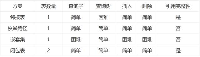 要删除一颗完整的子树,比如评论#4 和它所有的后代,可删除所有在 treepaths 表中后代为 #4的行,以及那些以评论#4后代为后代的行。闭包表的设计比嵌套集更加的直接,两者都能快捷地查询给定节点的祖先和后代,但是闭包表能更加简单地维护分层信息。这两个设计都比使用邻接表或者路径枚举更方便地查询给定节点的直接后代和祖先。然而你可以优化闭包表来使它更方便地查询直接父亲节点或者子节点:在 treepaths 表中添加一个 path_length 字段。一个节点的自我引用的path_length 为0,到它直接子节点的path_length 为1,再下一层为2,以此类推。这样查询起来就方便多了。每种设计都各有优劣,如何选择设计,依赖于应用程序的哪种操作是你最需要性能上的优化。2、如果你使用的数据库支持WITH 或者 CONNECT BY PRIOR 的递归查询,那能使得邻接表的查询更高效。3、枚举路径能够很直观地展示出祖先到后代之间的路径,但同时由于它不能确保引用完整性,使得这个设计非常脆弱。枚举路径也使得数据的存储变得比较冗余。4、嵌套集是一个聪明的解决方案,但可能过于聪明,它不能确保引用完整性。最好在一个查询性能要求很高而对其他要求一般的场合来使用它。5、闭包表是最通用的设计,并且以上的方案也只有它能允许一个节点属于多棵树。它要求一张额外的表来存储关系,使用空间换时间的方案减少操作过程中由冗余的计算所造成的消耗。这几种设计方案只是我们日常设计中的一部分,开发中肯定会遇到更多的选择方案。选择哪一种方案,是需要切合实际,根据自己项目的需求,结合方案的优劣,选择最适合的一种。我遇到一些开发人员,为了敷衍了事,在设计数据库表时,只考虑能否完成眼下的任务,不太注重以后拓展的问题,不考虑查询起来是否耗性能。可能前期数据量不多的时候,看不出什么影响,但数据量稍微多一点的话,就已经显而易见了(例如:可以使用外联接查询的,偏偏要使用子查询)。我觉得设计数据库是一个很有趣且充满挑战的工作,它有时能体现你的视野有多宽广,有时它能让你睡不着觉,总之痛并快乐着。后台回复关键字:资料领取,获取一份精心整理的技术干货