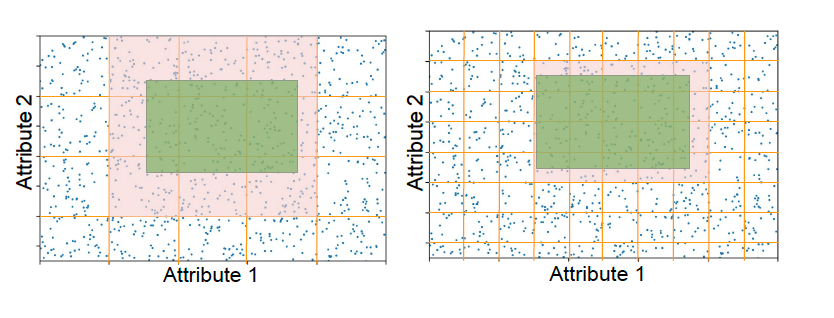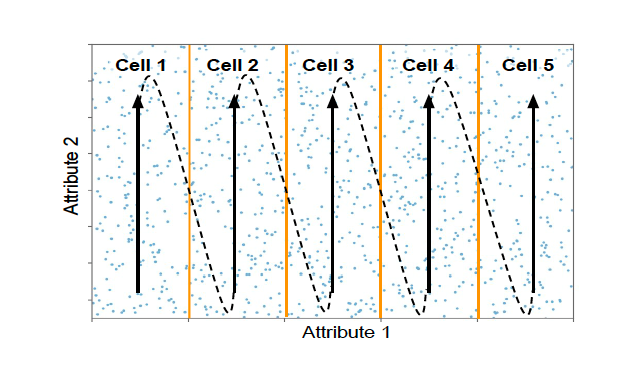 如果把整个多维空间看作一个欧几里得空间的话,不同于单维数据,多维数据不可以基于一个维度,或者属性进行排序,这导致很多单维上可以使用的索引方法在多维索引上并不适用。但是如果将整个空间分成一个个小的格子,在单独一个格子内使用统一维度进行排序,则在访问该格子内的数据中就可以通过使用单维索引技术加速索引。