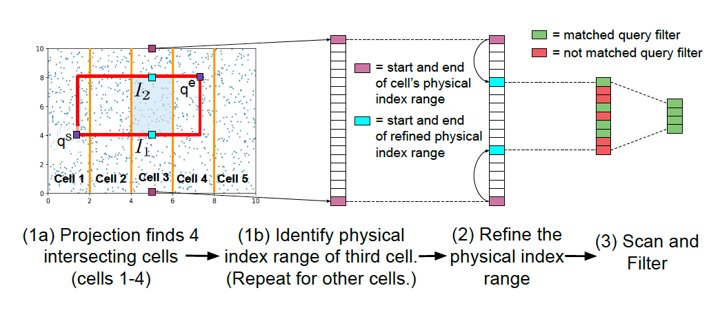 1. 提出了第一个学习型多维索引,Flood框架。Flood从一个筛选断言集合,即一个下采样的查询集合中学习查询集合的分布函数,以此调节数据存储布局。