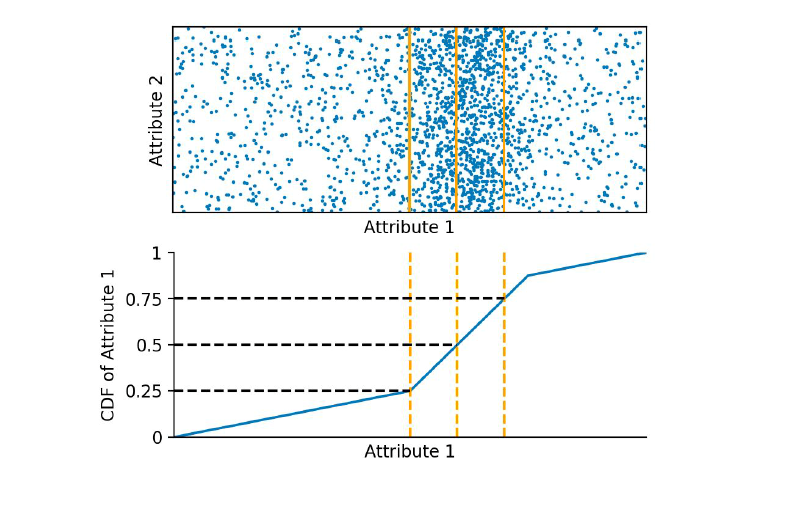 2. 使用一个累计分布函数CDF(Calculative Distribution Function)模型来将多维上可能的倾斜数据映射到一个均匀空间中。这个平滑(Flatten)过程使得每一个存储的存储单元储存的数据量基本一致。以此更快地进行索引。