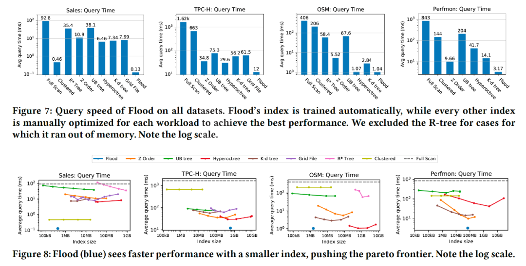 2. 使用三个真实数据集评估了多个不同的多维索引结构,实验显示Flood框架大大优于其他的多维索引结构。