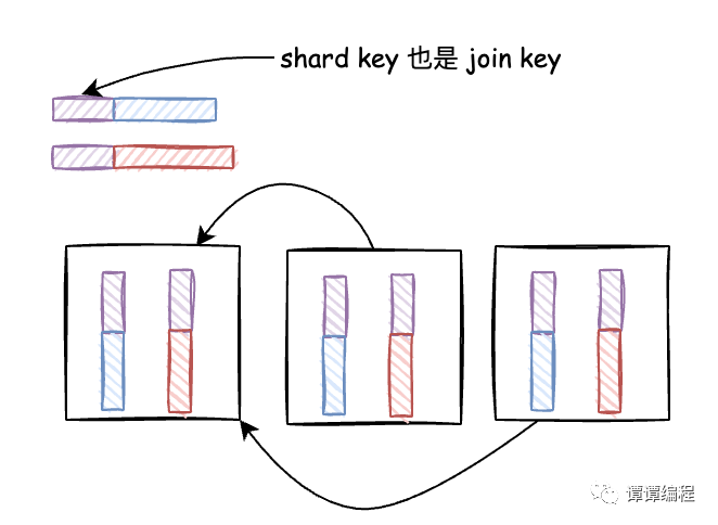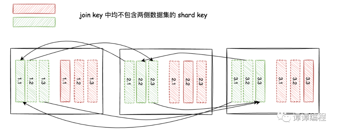 1.如果 join 一侧数据集 shard key 存在于 join key 中,则对另一侧数据选择同样的 shard key 进行分区2.如果两侧数据数据的 shard key 都不存在 join key 中,则需要对两侧数据都按照 join key 进行重新分区。