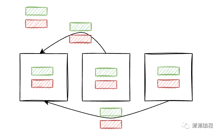 高能预警:下图展示了每个节点绿色分区数据集重新分片后分片的分片移动的方向,省略了红色数据集的移动方向。1.1表示以前分区1重新分区之后的1分区,所有绿色分区组合成了完整的绿色数据集。