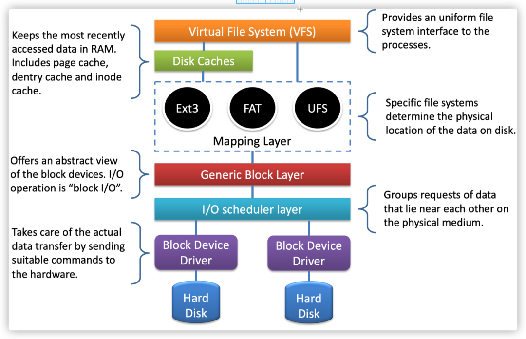 文件系统运作流程按照:vfs->磁盘缓存->实际磁盘文件系统->通用块设备层->io调度层->块设备驱动层->磁盘。具体流程的详细展现如下如