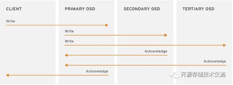 和ceph客户端一样,ceph的osd可以从ceph monitor获取最新的cluster map信息。ceph的osd可以使用crush算法,osd使用crush算法数据对象存储需要的pg id和主osd。当客户端写数据对象到主的osd,主的osd发现需要些副本,这个是副本的值是通过osd_pool_default_size来定义,然后主的osd拿到object id、pool名称、集群的map,然后使用cursh算法来计算从的osd的位置,然后主osd通过集群网络写数据对象到从的osd,完成后主的osd通知客户端写入成功。