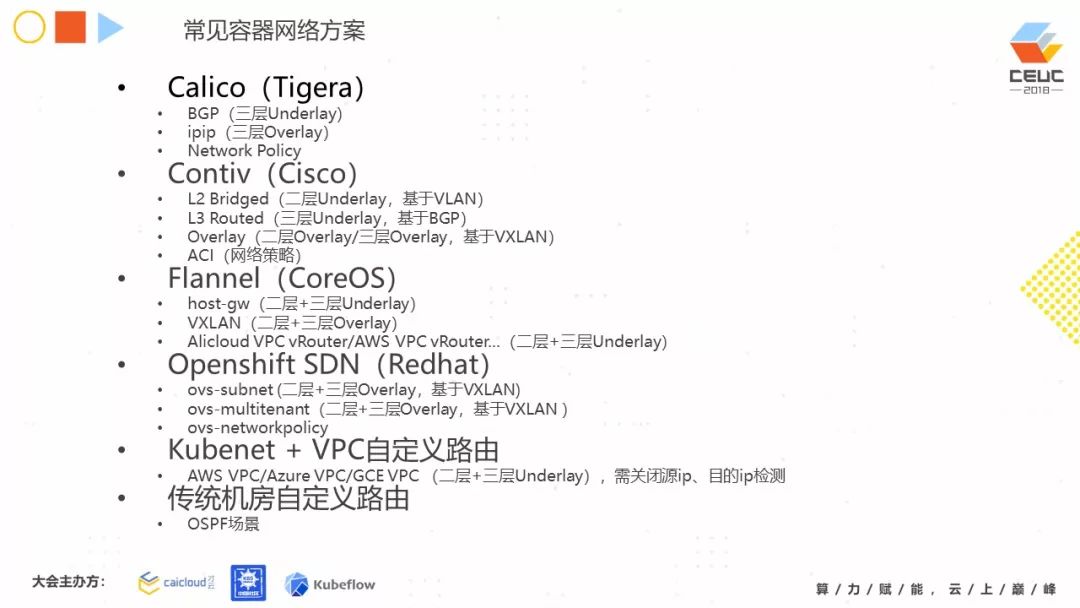 接下来,为大家讲解网易云如何基于 VPC 深度集成 Kubernetes 网络。首先,这里有很多方案,在这里我将它们都列出来。