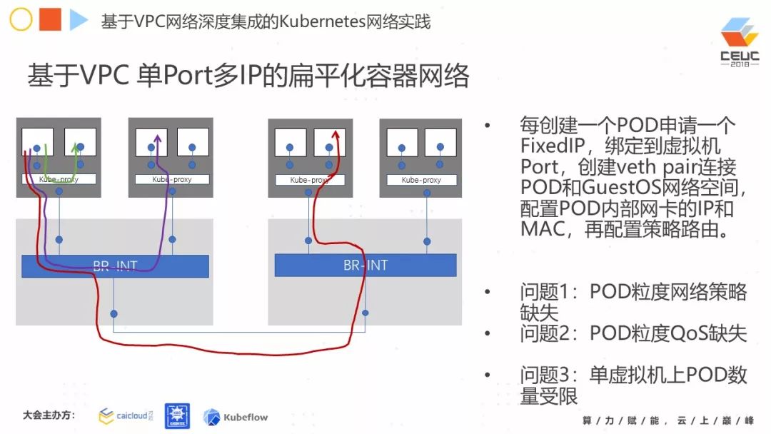 Pod 内部的网络策略是需要自己做,需要跑两套网络策略。第二个问题,QoS 同样如此。就是你端口粒度的 Port, QoS 需要自己做。第三个问题,单虚拟机上 Pod 数量有限制。这是因为 VPC 对于这个端口的 IP 数量有限制,也是就是 Pod 数量有限制。