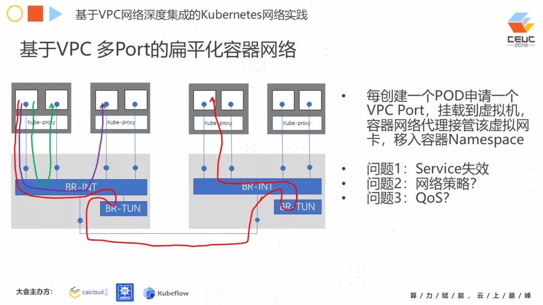 现在设计多个容器,多个 Pod 要怎么办呢?每申请一个 Pod,在下层的 VPC 申请一个 VPC IP,绑到这个虚拟机的端口上,然后通过 veth pair(就是容器的空间和 GuestOS 的空间连起来),把 Pod 里的 IP 配置上,再配置策略路由,就有一个在节点内部的转发。