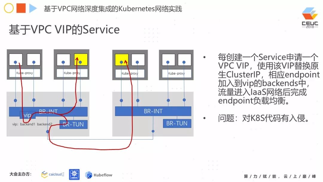 第一种方案:基于 VPC VIP 的 Service。利用 VPC VIP,每创建一个 Sevice,就同时申请一个 VPC VIP。然后用这个 VIP 把原来的 CluserIP 换掉,再把 endpoint 加到 VIP 的后端。当流量进到二层后,它就会进入到 VIP 中,然后进行转发。但是这里有一个问题,目前的 Kubernetes ClusterIP 是在 API Server 里做的。在这个方案中,比较糟糕的是在设计时需要修改这一块的代码。