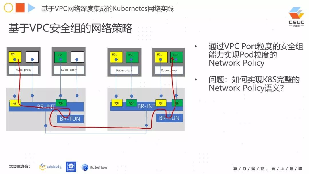 第二种方案:通过 VPC 的端口安全组,实现 Pod 粒度的网络策略。比如,两个 APP 互相之间要有通讯,我就可以在 Pod 的端口上做文章,把这个 Policy 实现。但是有个问题 ,你需要完成对 Kubernetes 整个网络策略进行语义转换。在 Kubernetes 的网络策略中,同一个 Namespace 里面的哪些 Pod 能够访问哪些 Pod 的哪些端口,哪些 Namespace 能够访问哪些 Pod 的哪些端口,那么你必须完成这种语义转换。