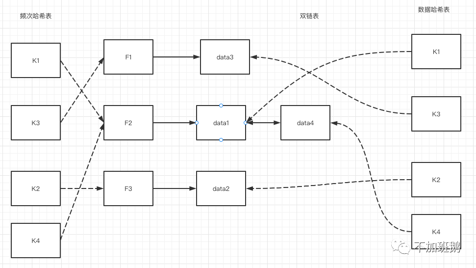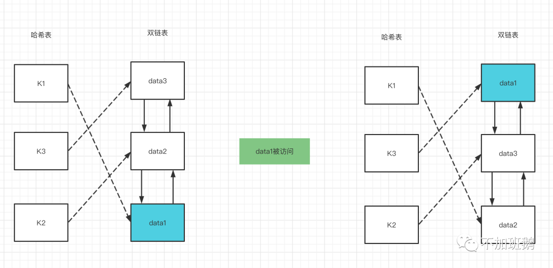 LRU淘汰策略,英文名Least Recently Used,意思是最近最少使用的淘汰算法。LRU记录数据访问历史,按访问的先后顺序进行排序优先淘汰最近没有访问过的数据。LRU的实现一般使用一个双向链表最近访问的放在队头从队尾开始淘汰。虽然看着data1被访问后迁移了3步,但因为是双向链表实际上只是从队尾删除插入队头,data3和data2都不用移动。