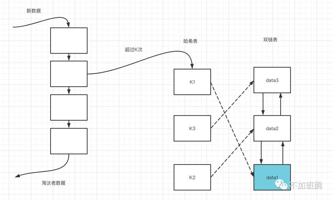 LRU-K与LRU区别是,LRU-K多了一个数据访问历史记录队列。队列中维护着数据被访问的次数以及时间戳,当队列超过限制就会淘汰老的访问次数少的数据,