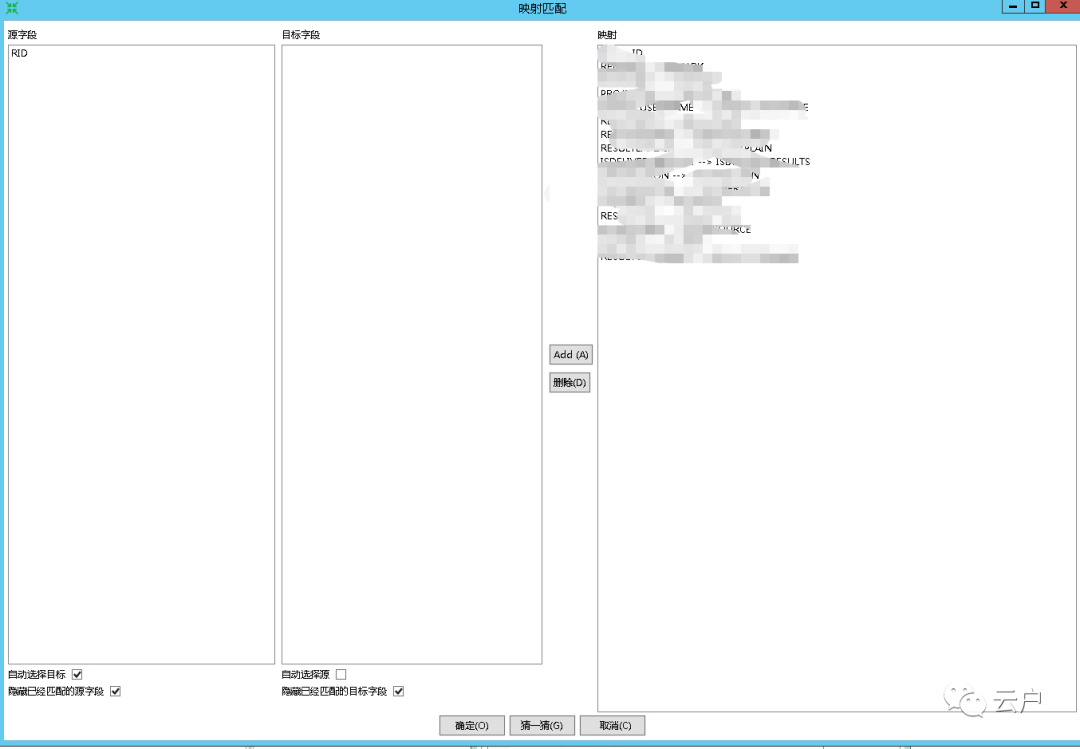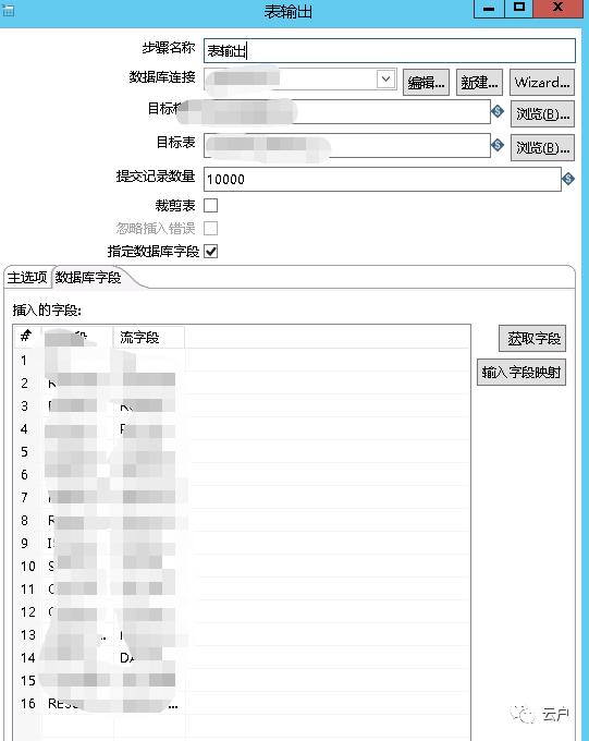 表输出中需要选择数据库连接,即数据最终要推送的目标数据源 目标模式:在oracle作为表输出的数据源时,需要明确目标模式 目标表:对应输出表的表名 提交记录数量:最大作为一批次向目标数据源commit的数据记录限制,需要根据实际情况设置,比如如果单批次10000数据的时间必须一致(时间戳模式),那么此处应设置为10000 指定数据字段:需要做字段映射关系设置时应选择(一般都需要) 获取字段:根据表输入和表输出的字段生成初始映射关系 输入字段映射:需要对字段映射关系做调整时使用,比如部分字段不推送