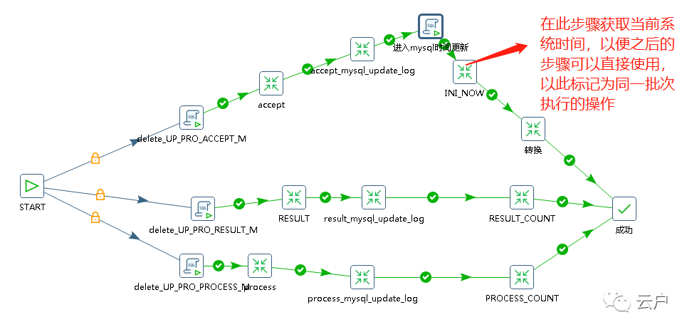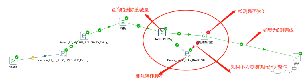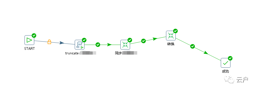 如上图中,作业的执行顺序是start->truncateXXX->同步->转换->成功,任何一个环节异常都会导致作业失败。