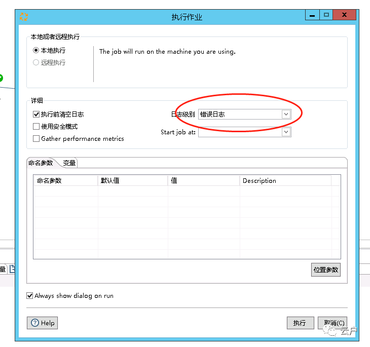 选择日志类型,在测试时可以选择基本日志,在正常启用后建议把日志设置为错误日志级别,也就是有异常时才会记录,主要可以大大提升kettle的运行稳定性,因为日志会在控制台输出,而长时间的输出会导致内存溢出等异常。