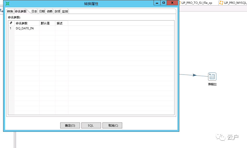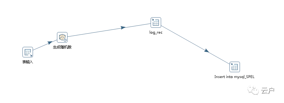 上图的转换定义了在数据集输入(oracle)后,首先为数据集生成UUID,然后插入记录表,最后交换至mysql的目标库。