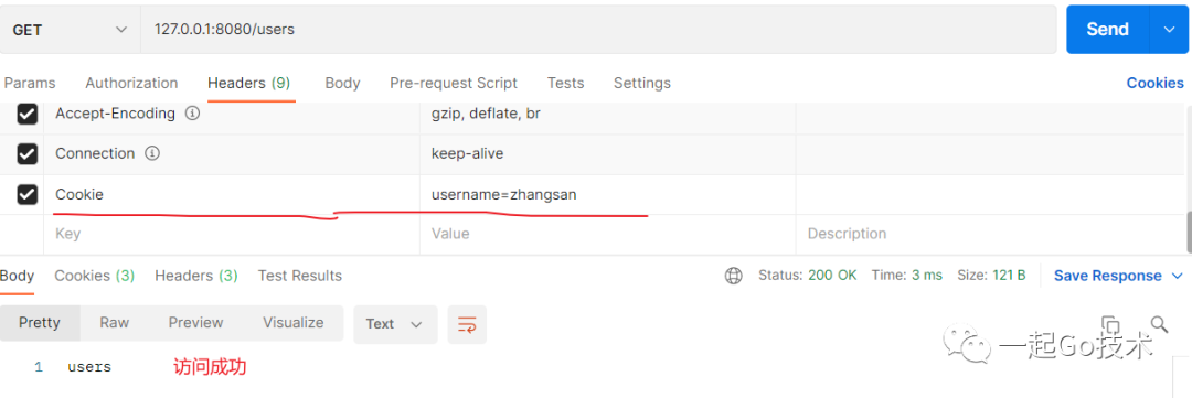 可以看到,zhangsan 成功登录了。接着在在/users接口的headers中带上刚才的cookie的值,访问成功: