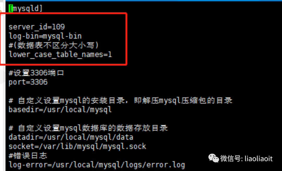 [mysqld]server_id=109log-bin=/usr/local/mysql/binlog/mysql-bin#设置最大100MBmax_binlog_size=104857600#设置了只保留7天BINLOG(单位:天)expire_logs_days = 7#binlog日志只记录指定库的更新binlog-do-db=liri_ext#数据表不区分大小写#lower_case_table_names=1#设置3306端口port=3306# 自定义设置mysql的安装目录,即解压mysql压缩包的目录basedir=/usr/local/mysql# 自定义设置mysql数据库的数据存放目录datadir=/usr/local/mysql/datasocket=/var/lib/mysql/mysql.sock#错误日志log-error=/usr/local/mysql/logs/error.log# 允许最大连接数max_connections=20000# 允许连接失败的次数,这是为了防止有人从该主机试图攻击数据库系统max_connect_errors=10# 服务端使用的字符集默认为UTF8character-set-server=utf8# 创建新表时将使用的默认存储引擎default-storage-engine=INNODB# 默认使用“mysql_native_password”插件认证default_authentication_plugin=mysql_native_password#sql_mode=STRICT_TRANS_TABLES,NO_ENGINE_SUBSTITUTIONsql_mode = STRICT_TRANS_TABLES,NO_ZERO_IN_DATE,NO_ZERO_DATE,ERROR_FOR_DIVISION_BY_ZERO,NO_ENGINE_SUBSTITUTION#分组最大值group_concat_max_len = 204800[mysql]# 设置mysql客户端默认字符集default-character-set=utf8[client]# 设置mysql客户端连接服务端时默认使用的端口和默认字符集port=3306default-character-set=utf8socket=/var/lib/mysql/mysql.sock