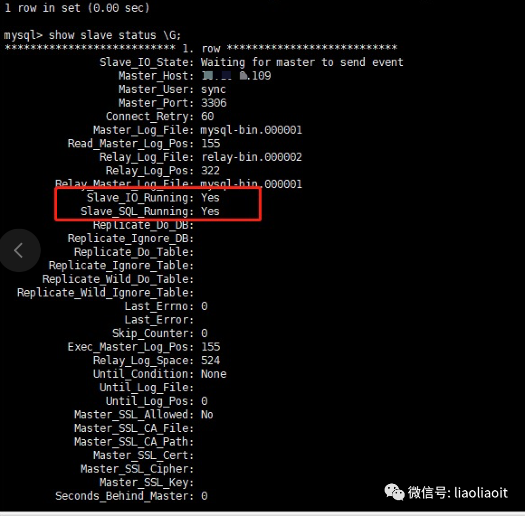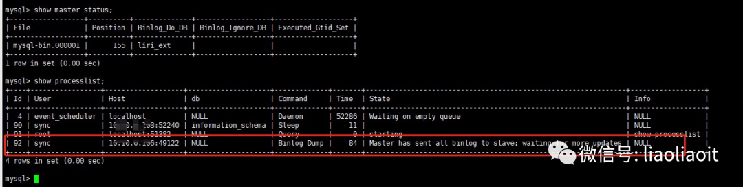 #创建目录mkdir /usr/local/mysql/binlog#重新授权chown -R mysql:mysql /usr/local/mysqlmysql -uroot -pupdate user set host='%' where user='sync';mysql>CREATE USER 'sync'@'%' IDENTIFIED BY 'sync';mysql>ALTER USER 'sync'@'%' IDENTIFIED BY 'Ab1234568';#授权mysql>use mysqlmysql>grant all privileges on *.* to 'sync'@'%';mysql>flush privileges;mysql>exitvi /use/local/mysql/my.cnfserver-id=109log-bin=mysql-binservice mysqld restartmysql -uroot -h 127.0.0.1 -pmysql> show master status;+------------------+----------+--------------+------------------+-------------------+| File | Position | Binlog_Do_DB | Binlog_Ignore_DB | Executed_Gtid_Set |+------------------+----------+--------------+------------------+-------------------+| mysql-bin.000001 | 155 | | | |+------------------+----------+--------------+------------------+-------------------+1 row in set (0.01 sec)mysql> show processlist;+----+-----------------+-------------------+--------------------+-------------+-------+---------------------------------------------------------------+------------------+| Id | User | Host | db | Command | Time | State | Info |+----+-----------------+-------------------+--------------------+-------------+-------+---------------------------------------------------------------+------------------+| 4 | event_scheduler | localhost | NULL | Daemon | 52286 | Waiting on empty queue | NULL || 90 | sync | 192.168.1.103:52240 | information_schema | Sleep | 11 | | NULL || 91 | root | localhost:51382 | NULL | Query | 0 | starting | show processlist || 92 | sync | 192.168.1.106:49122 | NULL | Binlog Dump | 84 | Master has sent all binlog to slave; waiting for more updates | NULL |+----+-----------------+-------------------+--------------------+-------------+-------+---------------------------------------------------------------+------------------+4 rows in set (0.00 sec)Command为Binlog Dump为正常。
