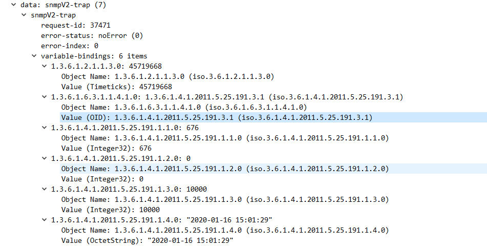 Message:version=version-2ccommunity=data=PDUs:snmpV2-trap=SNMPv2TrapPDU:request-id=37471error-status=noErrorerror-index=0variable-bindings=VarBindList:VarBind:name=1.3.6.1.2.1.1.3.0=_BindValue:value=ObjectSyntax:application-wide=ApplicationSyntax:timeticks-value=45719668VarBind:name=1.3.6.1.6.3.1.1.4.1.0=_BindValue:value=ObjectSyntax:simple=SimpleSyntax:objectID-value=1.3.6.1.4.1.2011.5.25.191.3.1VarBind:name=1.3.6.1.4.1.2011.5.25.191.1.1.0=_BindValue:value=ObjectSyntax:simple=SimpleSyntax:integer-value=676VarBind:name=1.3.6.1.4.1.2011.5.25.191.1.2.0=_BindValue:value=ObjectSyntax:simple=SimpleSyntax:integer-value=0VarBind:name=1.3.6.1.4.1.2011.5.25.191.1.3.0=_BindValue:value=ObjectSyntax:simple=SimpleSyntax:integer-value=10000VarBind:name=1.3.6.1.4.1.2011.5.25.191.1.4.0=_BindValue:value=ObjectSyntax:simple=SimpleSyntax:string-value=time