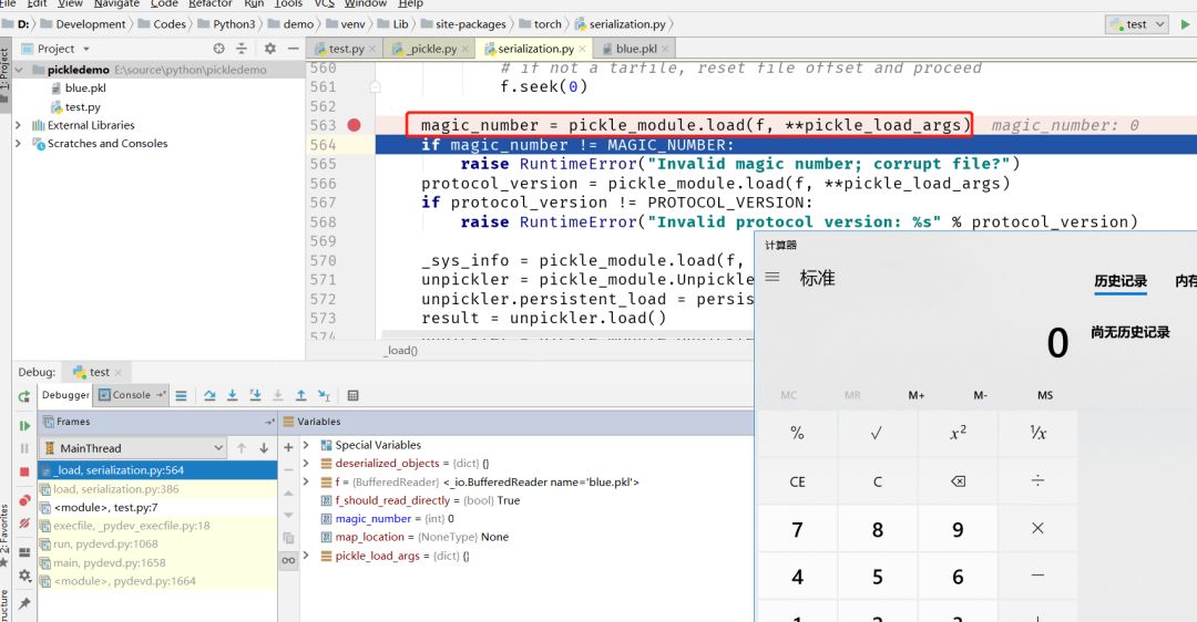 在后面的反序列化的过程直接调用的是 pickle_module.load() 函数,相当于是在调用 pickle.load()