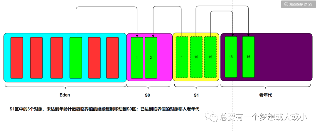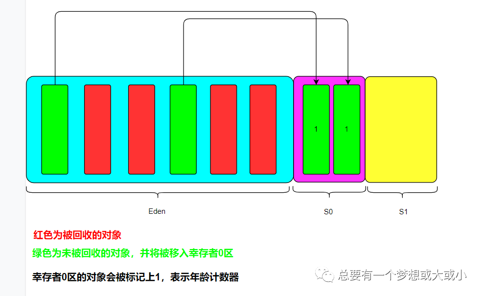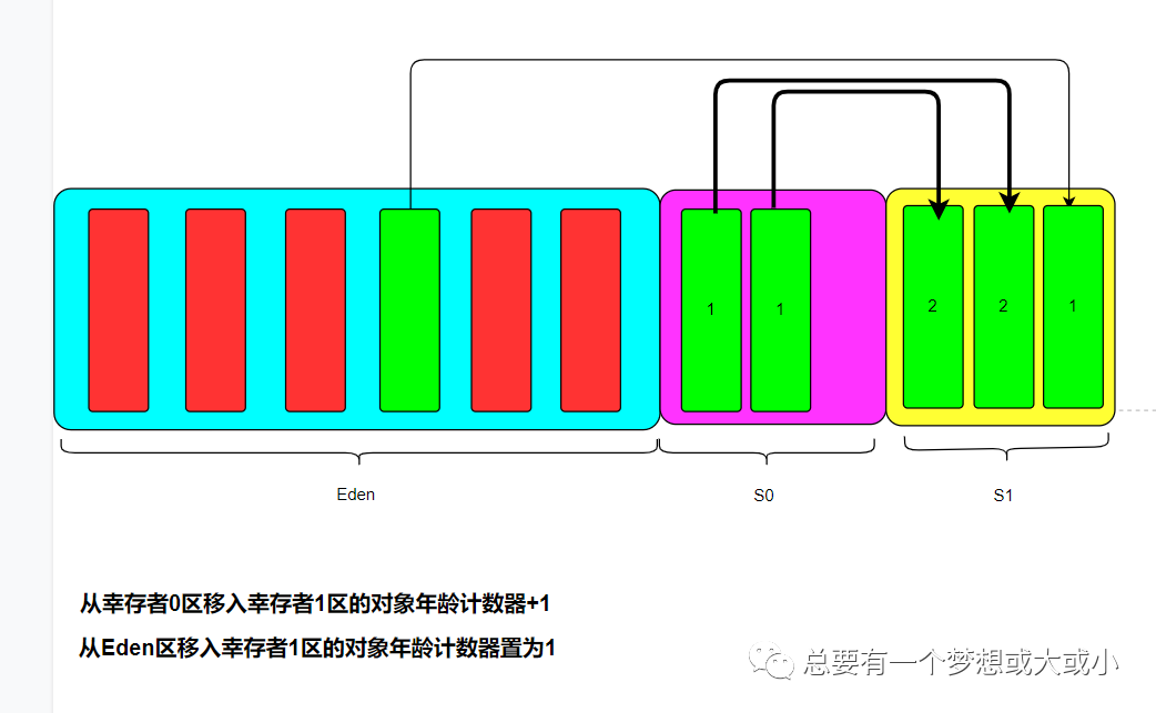 3、当再次进行垃圾回收时,将会把S0区未被回收对象移入S1区,并将其年龄计数器+1;Eden区中未被回收的对象移入S1区,为其分配年龄计数器,置为1