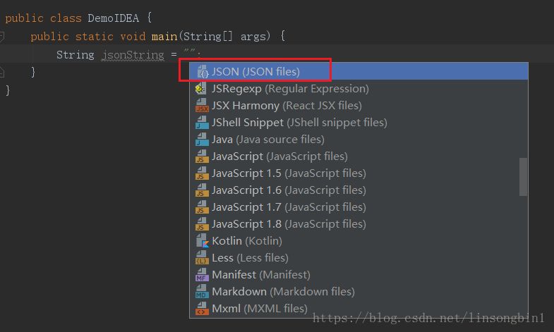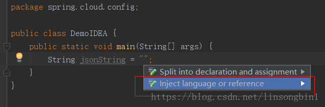 先将焦点定位到双引号里面,使用alt+enter快捷键弹出inject language视图,并选中