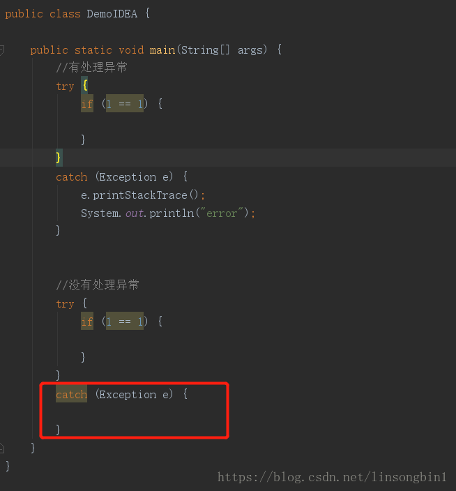 catch语句里没有处理异常,是极其危险的。我们可以IDEA里面方便找到所有这样的代码。