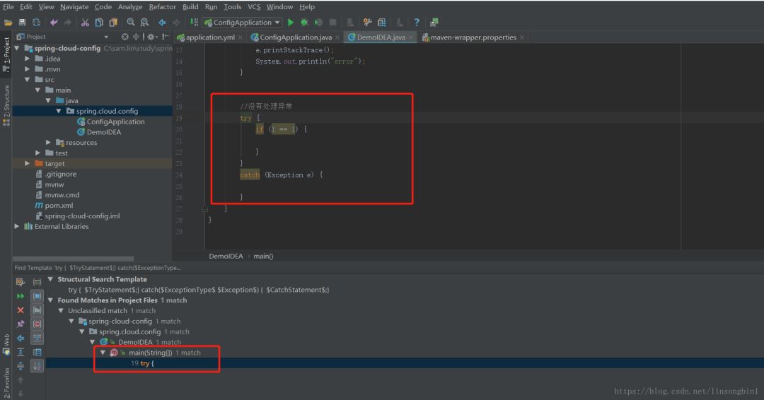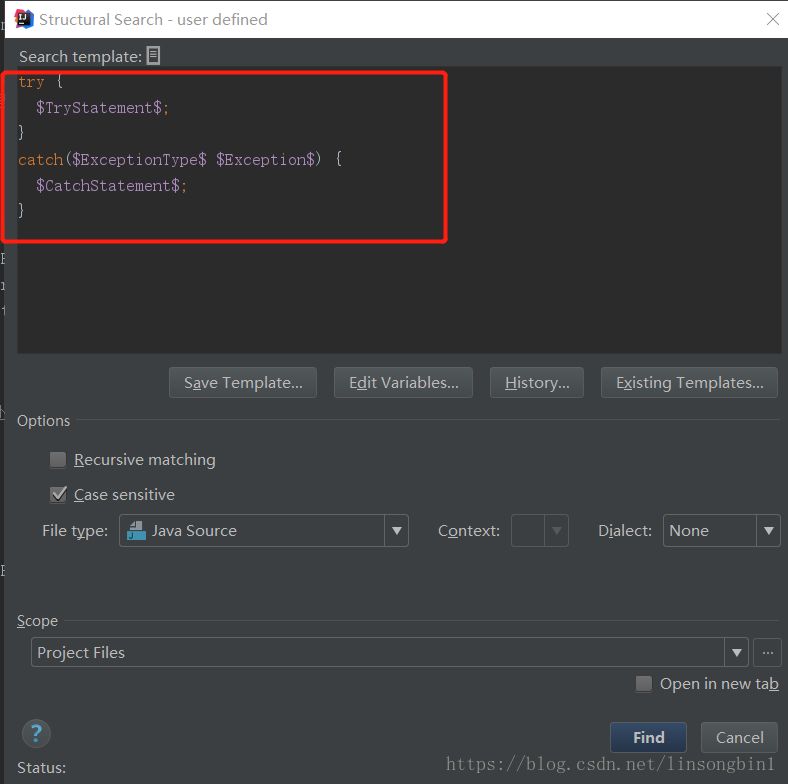 这个也是我非常喜欢的一个功能,可以根据模板来找到与模板匹配的代码块。比如说:想在整个工程里面找到所有的try catch语句,但是catch语句里面没有做异常处理的。