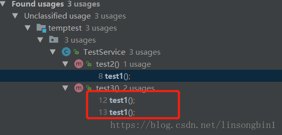 如果你想精确的列出到底哪些地方调用了test1()方法,你需要使用alt+f7这个快捷键。