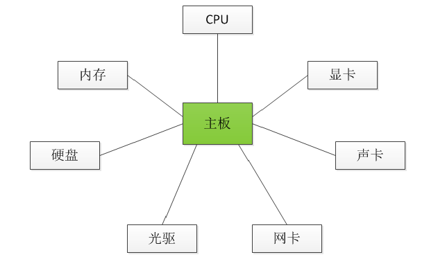 (7)迪米特法则:迪米特法则又叫最少知识原则,一个对象应当对其他对象有尽可能少的了解。(迪米特法则简单的说就是如何做到"低耦合",门面模式和调停者模式就是对迪米特法则的践行。对于门面模式可以举一个简单的例子,你去一家公司洽谈业务,你不需要了解这个公司内部是如何运作的,你甚至可以对这个公司一无所知,去的时候只需要找到公司入口处的前台美女,告诉她们你要做什么,她们会找到合适的人跟你接洽,前台的美女就是公司这个系统的门面。再复杂的系统都可以为用户提供一个简单的门面,Java Web开发中作为前端控制器的Servlet或Filter不就是一个门面吗,浏览器对服务器的运作方式一无所知,但是通过前端控制器就能够根据你的请求得到相应的服务。调停者模式也可以举一个简单的例子来说明,例如一台计算机,CPU、内存、硬盘、显卡、声卡各种设备需要相互配合才能很好的工作,但是如果这些东西都直接连接到一起,计算机的布线将异常复杂,在这种情况下,主板作为一个调停者的身份出现,它将各个设备连接在一起而不需要每个设备之间直接交换数据,这样就减小了系统的耦合度和复杂度,如下图所示。迪米特法则用通俗的话来将就是不要和陌生人打交道,如果真的需要,找一个自己的朋友,让他替你和陌生人打交道。)