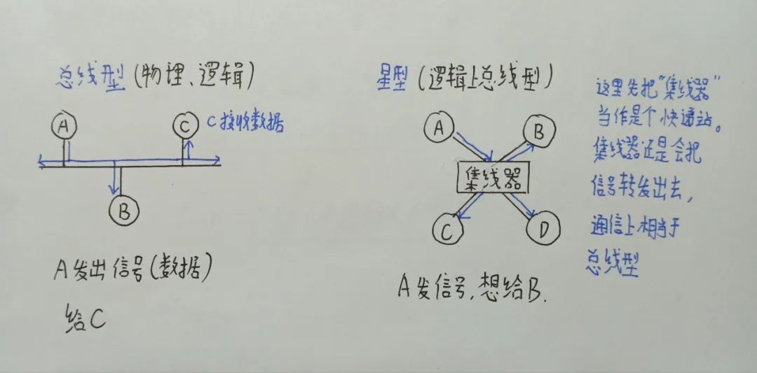典型拓扑结构:总线型、星型(逻辑总线)