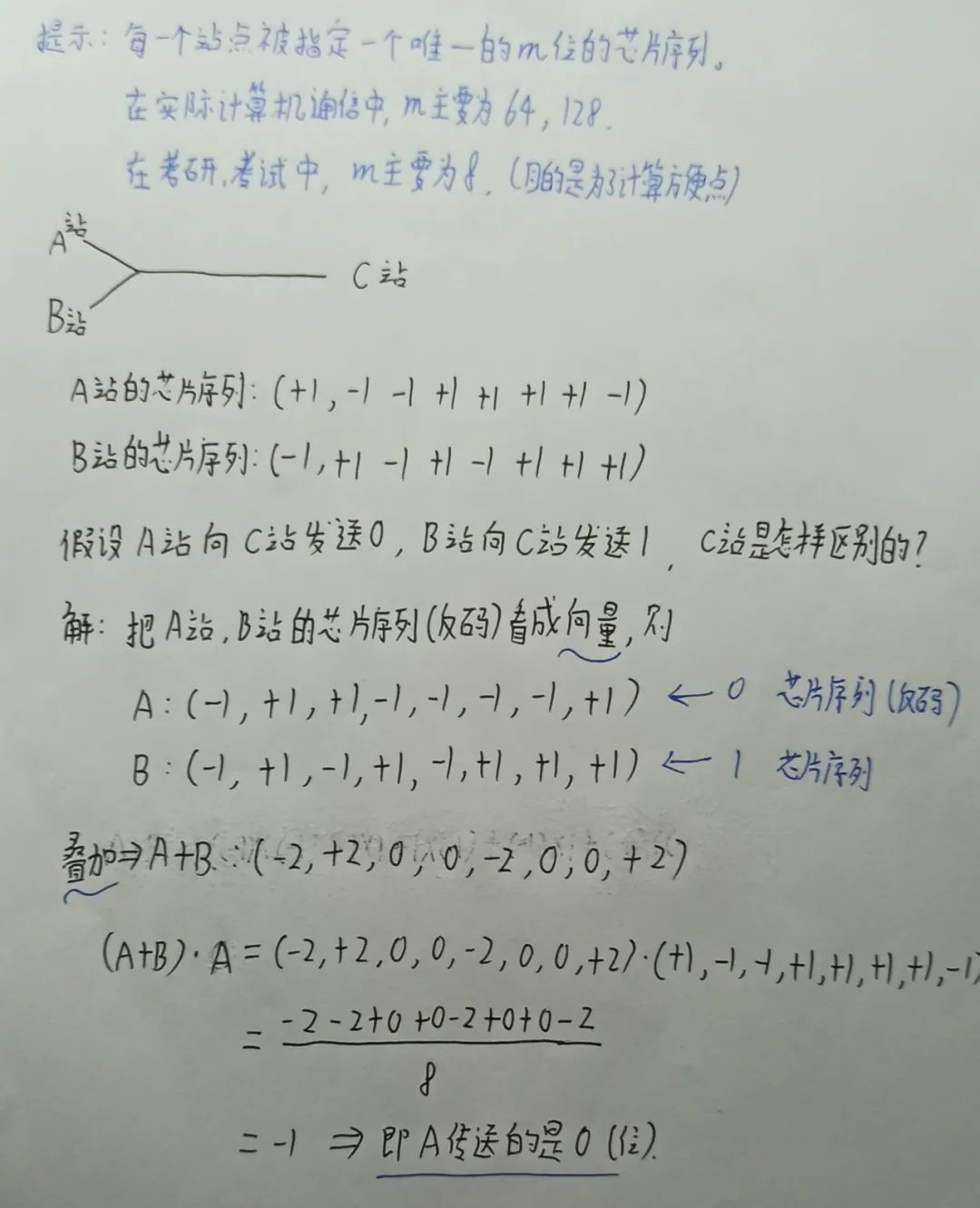 发送1时,站点发送芯片序列;发送0时,发送芯片序列反码(通常把0写出-1)