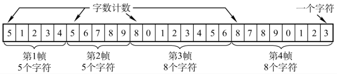 帧首部使用一个计数字段(第一个字节,8位)来标明帧内的字符数。