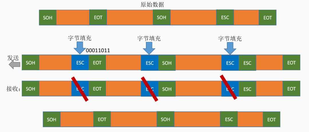 3. 当传送的帧是由非ASCII码的文本文件组成时(二进制代码的程序或图像等),可能会有重复字符(字节);进而导致错误地找到帧的边界,也把帧后面的数据丢弃了;