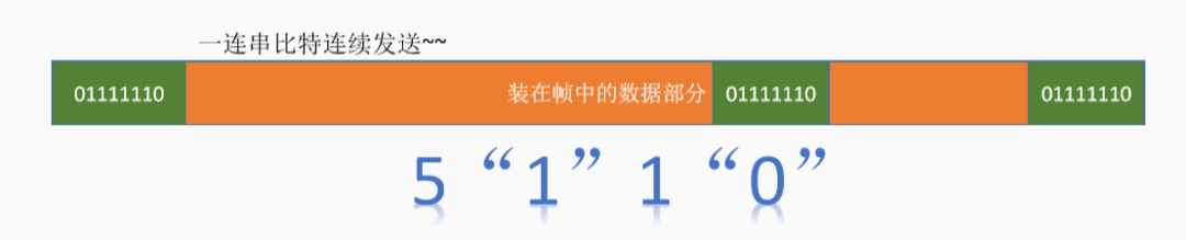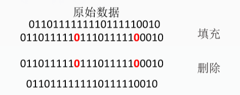 在接收端,收到一个帧时,先找到标志字段确定边界,再用硬件对比特流进行扫描。发现连续5个1时,就把后面的0删除。