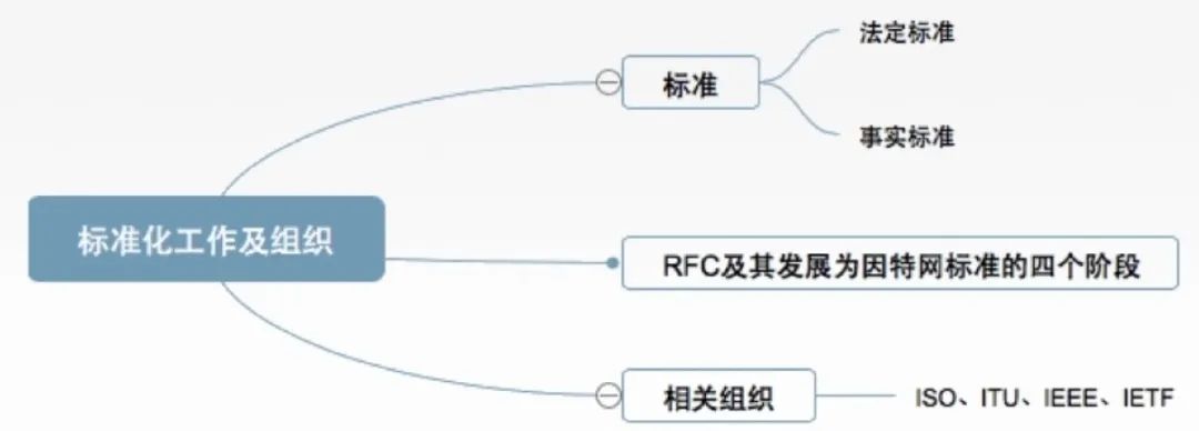 事实标准:某些公司的产品在竞争中占据了主流,时间长了,这些产品中的协议和技术就成了标准,如TCP/IP