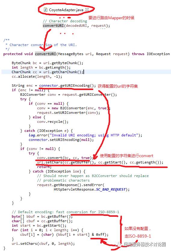 从源码上来看,在CoyoteAdapter中解析request的时候,有对应的convertURI方法对decodeedURI进行解析: