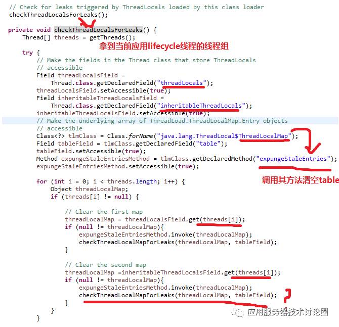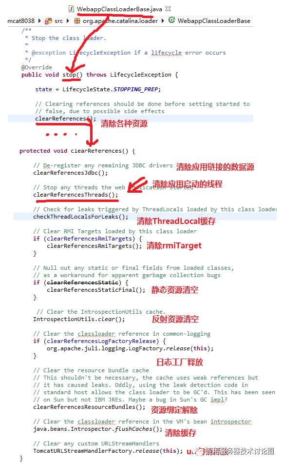 所以,我们学习这段代码的同时,在写应用的时候真是要一定注意,别让Tomcat费这大力气清空一些东西,你应用中随便留了一大坨垃圾在里面,久而久之,啥应用服务器也会崩掉啊!