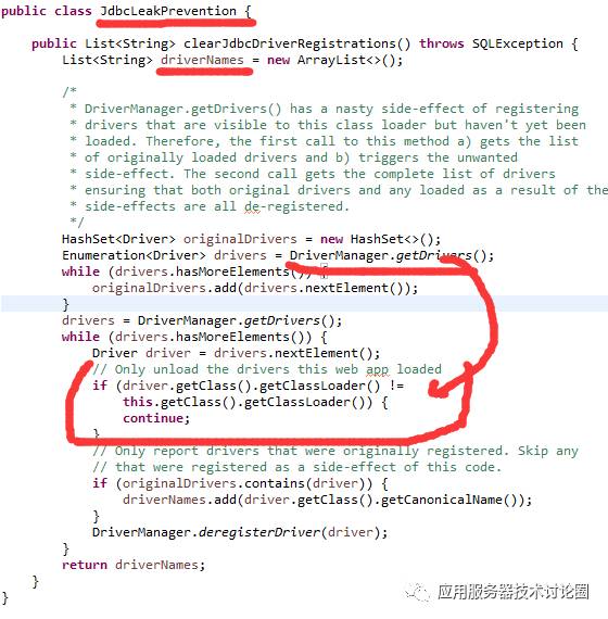 实际就是DriverManager能拿到所有的Driver的一个集合,然后判断Driver该类是否是由当前应用类加载器进行加载的,如果是的话,直接调用DriverManager.deregisterDriver对其进行卸载;
