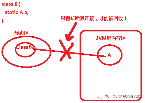 应用中有一个ClassB,在Class B中持有一个Class A的静态属性,以这种情况为例,GC在回收的时候Class B,如果Class B中持有的static A属性为null的话,Class B立刻被回收,而A对象也没有关联,也会立刻被回收;