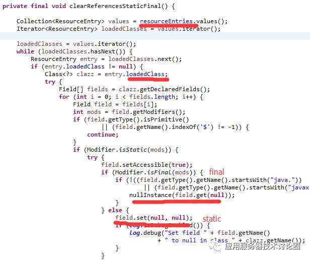 如上述代码中,resourceEntries实际就是WebappClassLoader已经load的Class资源,WebappClassLoader已经将其缓存起来,在WebappClassLoader要结束其使命的时候,将这些已经load的Class逐个遍历出来,判断其field是否有final或者static的属性,将其设置为null;