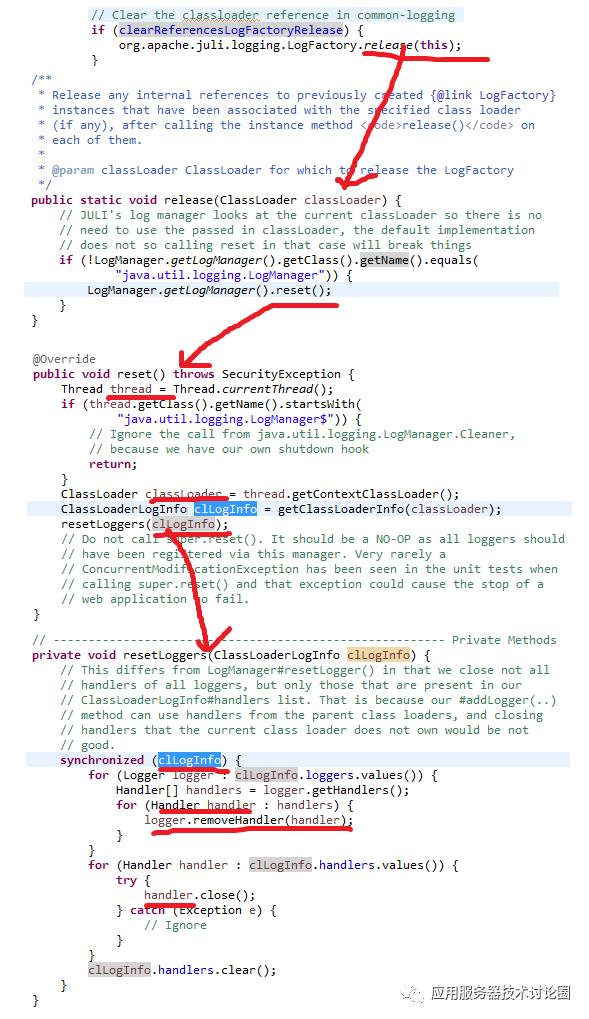 关于Logger实际上是和ClassLoader有关联的,从下面的代码中,我们可以得知,其之所以让ClassLoader于Logger脱钩,我们是为了拿到当前WebappClassLoader的在Logger注册的CLassLoaderInfo信息,而获得该信息的最终目的是让CLassLoaderInfo信息中的Handler从Logger中清除;