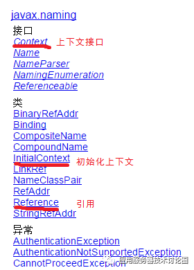 其中,我们关心的Context,IntialContext等接口都在javax.naming包中,这个包是JNDI的API包,