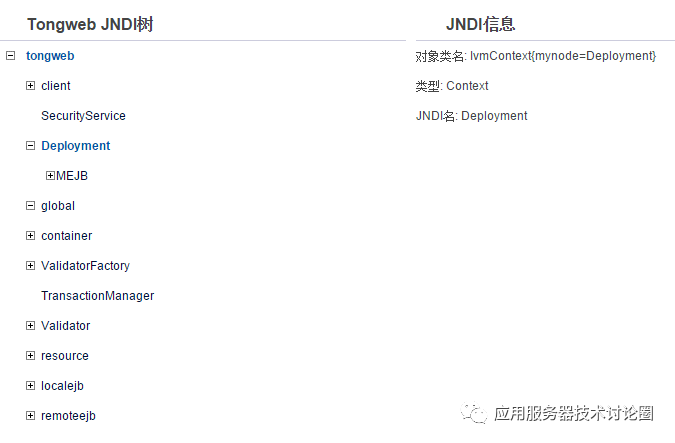 对于JNDI,其最终实现可以理解为一个存储设施,例如树就是一个比较经典的做法,你可以在内存中为其构造一个树,如Tomcat,OpenEJB中,大多数应用服务器都提供了JNDI的查找,我们可以看一下国产应用服务器TongWeb的JNDI树: