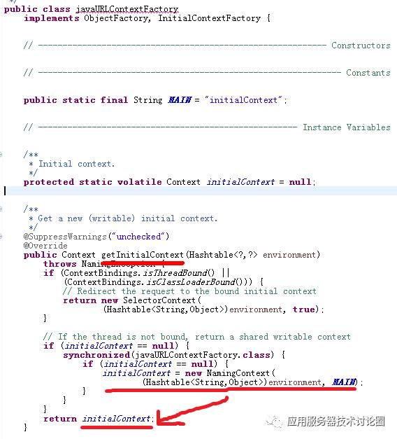 InitialiContextFactory:主要是初始化上下文InitialContext的生成工厂,它能生成InitialContext,所以至关重要,因为我们在客户端需要在环境变量率先指定这个工厂,如在Jboss中,我们在代码中需要将工厂设置到env中: