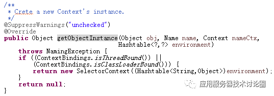 而javaURLContextFactory恰恰是创建默认的Context节点类型的,所以从代码上你可以看到其返回的还是SelectorContext,依然是Context接口类型;