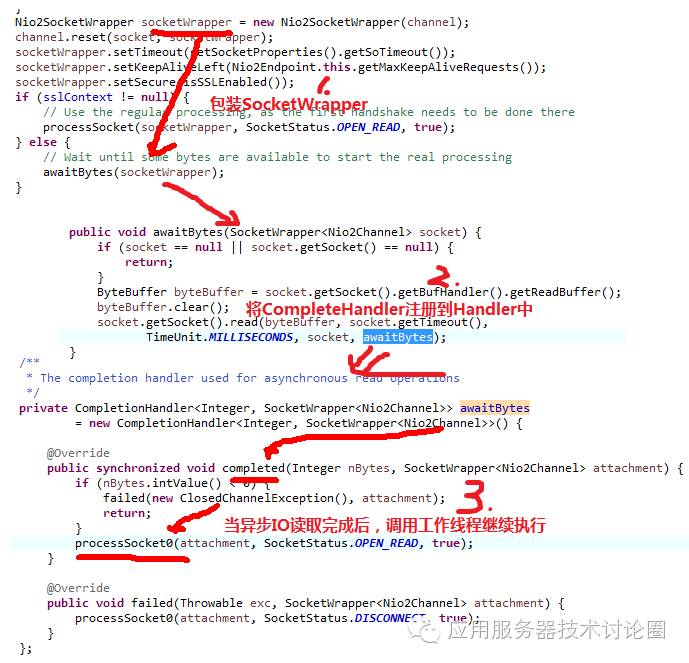 在NIO2的通道下,Acceptor线程结束之后,并不会直接调用工作线程也就是SocketProcessor,而是利用NIO2的机制,CompleteHandler完成处理器去去处理任务:
